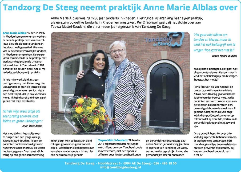 Eigenaar Taqwa Mattni-Soudani nam de huidige praktijk in de Steeg over van tandarts F. Fabels en verwelkomde later de patiënten van tandarts A. M. Ablas.